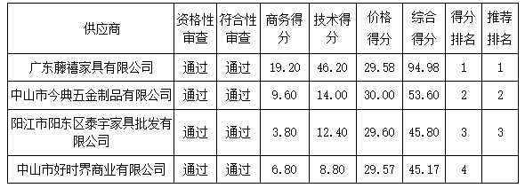 投標(biāo)結(jié)果:最終評(píng)標(biāo)委員會(huì)一致推薦 廣東藤禧家具有限公司 為中標(biāo)單位,中標(biāo)金額為人民幣 577882.00 元,(大寫金額: 伍拾柒萬柒仟捌佰捌拾貳元整 )。