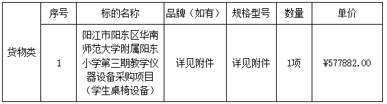 二、采購(gòu)項(xiàng)目名稱:陽江市陽東區(qū)華南師范大學(xué)附屬陽東小學(xué)第三期教學(xué)儀器設(shè)備采購(gòu)項(xiàng)目(學(xué)生桌椅設(shè)備)