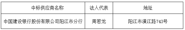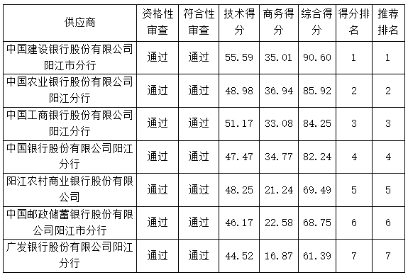 投標(biāo)結(jié)果:最終評(píng)標(biāo)委員會(huì)一致推薦中國(guó)建設(shè)銀行股份有限公司陽(yáng)江市分行為中標(biāo)單位。