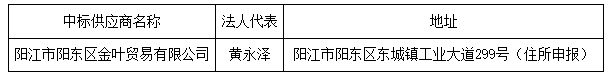 投標(biāo)結(jié)果:最終評(píng)標(biāo)委員會(huì)一致推薦 陽(yáng)江市陽(yáng)東區(qū)金葉貿(mào)易有限公司 為預(yù)中標(biāo)單位,中標(biāo)折扣率為 99.50% 。