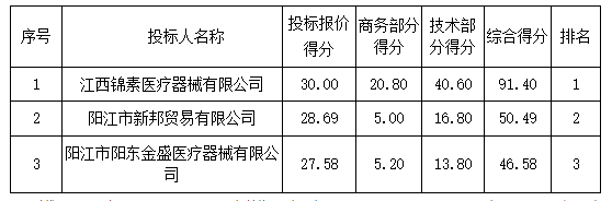 投標結果:最終評標委員會一致推薦 江西錦素醫(yī)療器械有限公司 為中標單位,中標金額為人民幣 301400.00 元,(大寫金額: 叁拾萬零壹仟肆佰元整 )。