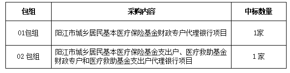1. 項目名稱:陽江市城鄉(xiāng)居民醫(yī)療保險基金和醫(yī)療救助基金代理銀行采購項目(二次招標(biāo))