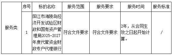 二、采購項(xiàng)目名稱:陽江市海陵島經(jīng)濟(jì)開發(fā)試驗(yàn)區(qū)財(cái)政和國有資產(chǎn)管理局2025-2027年度代管資金財(cái)政專戶代理銀行采購項(xiàng)目