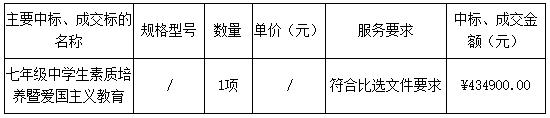 廣東業(yè)信采購(gòu)招標(biāo)有限公司受 陽(yáng)江市第二中學(xué) 的委托,于2024年8月21日就 陽(yáng)江市第二中學(xué)七年級(jí)中學(xué)生素質(zhì)培養(yǎng)暨愛(ài)國(guó)主義教育項(xiàng)目 (項(xiàng)目編號(hào):YXCG-20240815)采用公開(kāi)比選方式進(jìn)行采購(gòu)。現(xiàn)就本次采購(gòu)的成交結(jié)果公告如下: