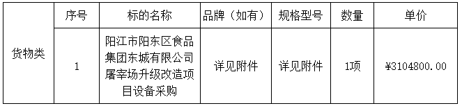 二、采購(gòu)項(xiàng)目名稱(chēng):陽(yáng)江市陽(yáng)東區(qū)食品集團(tuán)東城有限公司屠宰場(chǎng)升級(jí)改造項(xiàng)目設(shè)備采購(gòu)