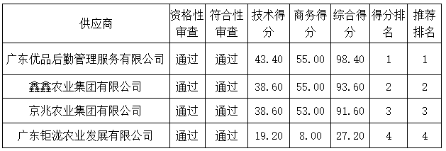 投標(biāo)結(jié)果:最終評(píng)標(biāo)委員會(huì)一致推薦廣東優(yōu)品后勤管理服務(wù)有限公司為中標(biāo)單位。替補(bǔ)供應(yīng)商:鑫鑫農(nóng)業(yè)集團(tuán)有限公司為替補(bǔ)供應(yīng)商。