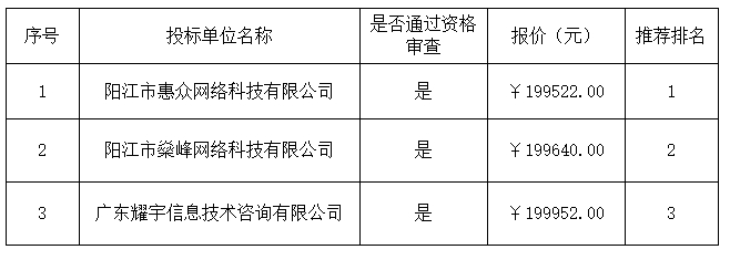 報價結果:最終詢價小組一致推薦陽江市惠眾網(wǎng)絡科技有限公司為成交單位,成交金額為人民幣199522.00元(大寫金額:壹拾玖萬玖仟伍佰貳拾貳元整)。