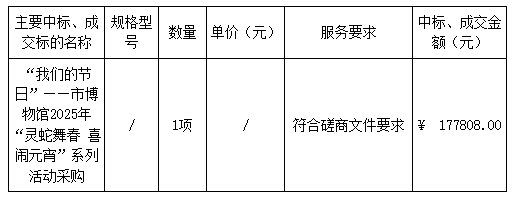 廣東業(yè)信采購招標(biāo)有限公司受 陽江市博物館 的委托,于2024年12月30日就 “我們的節(jié)日”——市博物館2025年“靈蛇舞春 喜鬧元宵”系列活動采購項目(項目編號:YXCG-20241218)采用競爭性磋商方式進(jìn)行采購?,F(xiàn)就本次采購的成交結(jié)果公告如下: