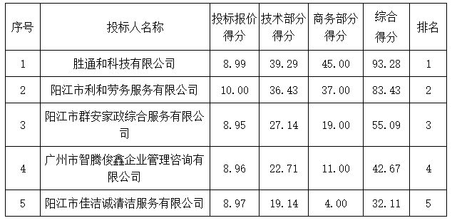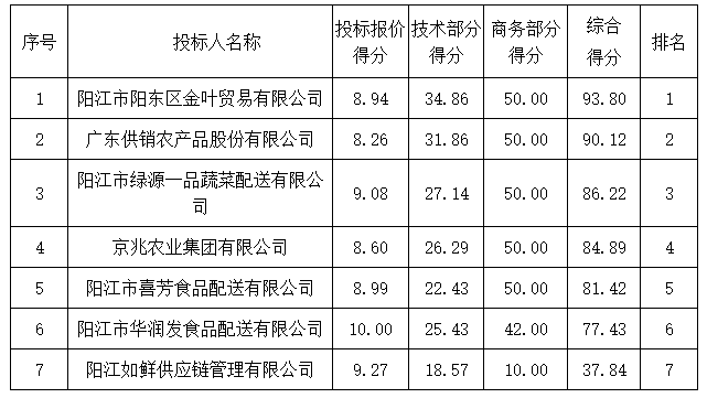 注:1.陽江市陽東區(qū)金葉貿(mào)易有限公司、陽江市綠源一品蔬菜配送有限公司、陽江市華潤(rùn)發(fā)食品配送有限公司提供《中小微企業(yè)聲明函》,為小型企業(yè),價(jià)格優(yōu)惠10%。