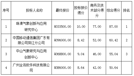 磋商結(jié)果:最終磋商小組一致推薦 珠澳氣象創(chuàng)新與應(yīng)用研究中心 為成交單位,成交金額為人民幣 333500.00元,(大寫金額: 叁拾叁萬叁仟伍佰元整 )。