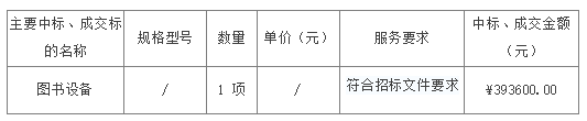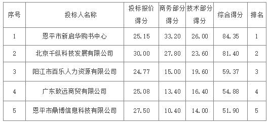 投標(biāo)結(jié)果:最終評標(biāo)委員會一致推薦 恩平市新啟華購書中心 為中標(biāo)單位,中標(biāo)金額為人民幣 393600.00 元,(大寫金額: 叁拾玖萬叁仟陸佰元整 )。