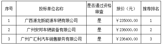報(bào)價(jià)結(jié)果:最終詢(xún)價(jià)小組一致推薦 廣西源龍新能源車(chē)輛有限公司 為成交單位,成交金額為人民幣 235000.00 元(大寫(xiě)金額: 貳拾叁萬(wàn)伍仟元整 )。