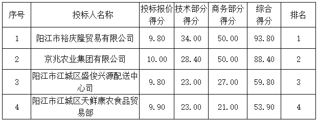 1.陽江市裕慶隆貿(mào)易有限公司、京兆農(nóng)業(yè)集團有限公司、陽江市江城區(qū)盛俊興源配送中心司、陽江市江城區(qū)天鮮康農(nóng)食品貿(mào)易部提供《中小微企業(yè)聲明函》,為微型企業(yè),價格優(yōu)惠10%。
