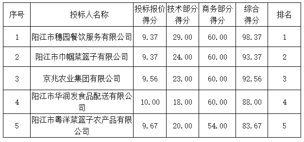 2.陽江市穗園餐飲服務有限公司、京兆農(nóng)業(yè)集團有限公司、陽江市粵洋菜籃子農(nóng)產(chǎn)品有限公司提供《中小微企業(yè)聲明函》,為微型企業(yè),價格優(yōu)惠10%。