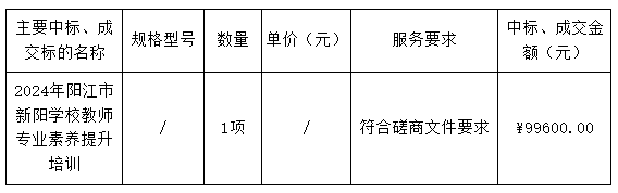 廣東業(yè)信采購(gòu)招標(biāo)有限公司受 陽(yáng)江市新陽(yáng)學(xué)校 的委托,于2025年3月4日就 2024年陽(yáng)江市新陽(yáng)學(xué)校教師專業(yè)素養(yǎng)提升培訓(xùn)項(xiàng)目(項(xiàng)目編號(hào):YXCG-20250208)采用競(jìng)爭(zhēng)性磋商方式進(jìn)行采購(gòu)。現(xiàn)就本次采購(gòu)的成交結(jié)果公告如下: