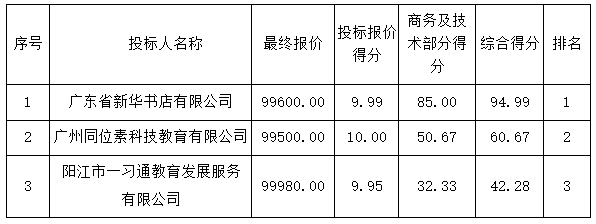 磋商結(jié)果:最終磋商小組一致推薦 廣東省新華書店有限公司 為成交單位,成交金額為人民幣 99600.00元,(大寫金額: 玖萬(wàn)玖仟陸佰元整 )。