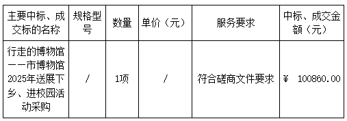 廣東業(yè)信采購招標(biāo)有限公司受 陽江市博物館 的委托,于2025年4月7日就 行走的博物館——市博物館2025年送展下鄉(xiāng)、進(jìn)校園活動采購項(xiàng)目(項(xiàng)目編號:YXCG-20250313)采用競爭性磋商方式進(jìn)行采購。現(xiàn)就本次采購的成交結(jié)果公告如下: