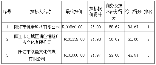 磋商結(jié)果:最終磋商小組一致推薦 陽江市像素科技有限公司 為成交單位,成交金額為人民幣 100860.00元,(大寫金額:壹拾萬零捌佰陸拾元整 )。