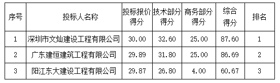 投標(biāo)結(jié)果:最終評(píng)標(biāo)委員會(huì)一致推薦 深圳市文燦建設(shè)工程有限公司 為預(yù)中標(biāo)單位,中標(biāo)金額為人民幣 401344.80 元,(大寫金額: 肆拾萬(wàn)零壹仟叁佰肆拾肆元捌角整 ) 。
