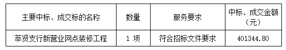 廣東業(yè)信采購(gòu)招標(biāo)有限公司受 陽(yáng)江農(nóng)村商業(yè)銀行股份有限公司 的委托,于2024年11月26日就 陽(yáng)江農(nóng)村商業(yè)銀行股份有限公司萃賢支行新營(yíng)業(yè)網(wǎng)點(diǎn)裝修工程項(xiàng)目(項(xiàng)目編號(hào):YXCG-20241022)采用公開招標(biāo)方式進(jìn)行采購(gòu)。現(xiàn)就本次采購(gòu)的中標(biāo)結(jié)果公告如下: