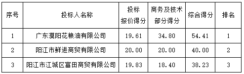 投標結(jié)果:最終評標委員會一致推薦 廣東漠陽花糧油有限公司 為預(yù)中標單位,中標金額為人民幣 1800.00 元/噸/年,(大寫金額: 壹仟捌佰元整 ) ,中標總金額為人民幣 672000.00 元,(大寫金額: 陸拾柒萬貳仟元整 )。