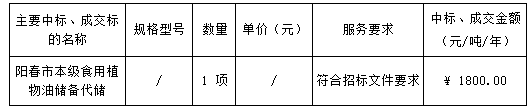 廣東業(yè)信采購招標有限公司受 粵糧(陽春市)糧油儲備管理有限公司 的委托,于2025年1月21日就 陽春市本級食用植物油儲備代儲項目(項目編號:YXCG-20241231)采用公開招標方式進行采購?,F(xiàn)就本次采購的中標結(jié)果公告如下: