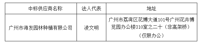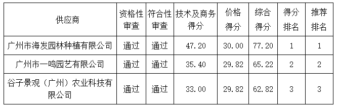 投標(biāo)結(jié)果:最終評(píng)標(biāo)委員會(huì)一致推薦 廣州市海發(fā)園林種植有限公司 為中標(biāo)單位,中標(biāo)金額為人民幣 262416.00 元,(大寫金額: 貳拾陸萬貳仟肆佰壹拾陸元整 )。