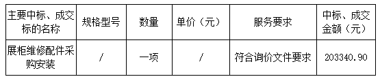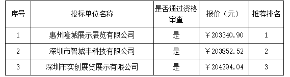 報(bào)價(jià)結(jié)果:最終詢價(jià)小組一致推薦 惠州隆城展示展覽有限公司 為成交單位,成交金額為人民幣 203340.90 元(大寫金額: 貳拾萬零叁仟叁佰肆拾元玖角整 )。
