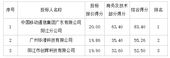 投標結(jié)果:最終評標委員會一致推薦 中國移動通信集團廣東有限公司陽江分公司 為預(yù)中標單位,中標金額為人民幣 287000.00 元,(大寫金額: 貳拾捌萬柒仟元整 ) 。