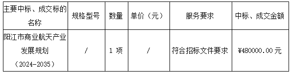 廣東業(yè)信采購招標有限公司受 陽江市工業(yè)和信息化局 的委托,于2024年7月26日就 陽江市商業(yè)航天產(chǎn)業(yè)發(fā)展規(guī)劃(2024-2035)項目(項目編號:YXCG-20240620)采用公開招標方式進行采購。現(xiàn)就本次采購的中標結(jié)果公告如下: