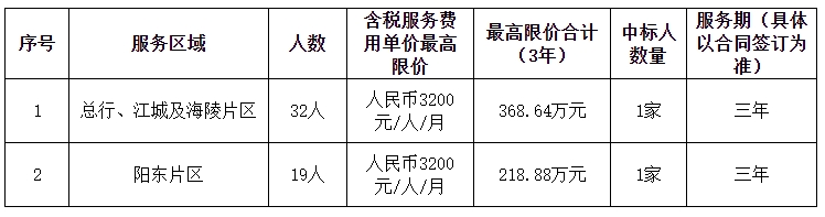 2)采購保安人數(shù):第一中標(biāo)單位不超過32人,(其中總行白天、兼夜間值班4人,江城片區(qū)21人、海陵片區(qū)7人)。第二中標(biāo)單位是陽東片區(qū)不超過19人。兩片區(qū)共控制人數(shù)不超過51人(具體招標(biāo)人數(shù)以實際需求為準(zhǔn)、詳細網(wǎng)點人員見附件)。