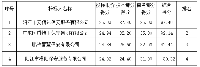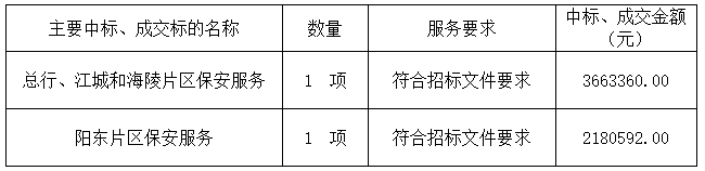 1.陽江市安信達保安服務(wù)有限公司為中標(biāo)單位,負責(zé)總行、江城和海陵片區(qū)保安服務(wù),中標(biāo)單價為人民幣3180.00 元/人,中標(biāo)總價為人民幣3663360.00元。