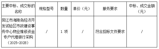 廣東業(yè)信采購(gòu)招標(biāo)有限公司受 陽(yáng)江市海陵島經(jīng)濟(jì)開發(fā)試驗(yàn)區(qū)市政建設(shè)事務(wù)中心 的委托,于2025年6月24日就 陽(yáng)江市海陵島經(jīng)濟(jì)開發(fā)試驗(yàn)區(qū)市政建設(shè)事務(wù)中心物業(yè)維修資金專戶代理銀行采購(gòu)項(xiàng)目(2025-2028) (項(xiàng)目編號(hào):YXCG-20250135)采用公開招標(biāo)方式進(jìn)行采購(gòu)。現(xiàn)就本次采購(gòu)的中標(biāo)結(jié)果公告如下: