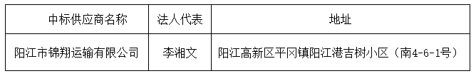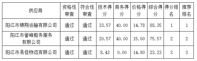投標(biāo)結(jié)果:最終評(píng)標(biāo)委員會(huì)一致推薦陽江市錦翔運(yùn)輸有限公司為中標(biāo)單位,單價(jià)匯總價(jià)中標(biāo)金額為人民幣6.75 元/噸,(大寫金額:陸元柒角伍分)。