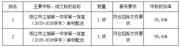 廣東業(yè)信采購(gòu)招標(biāo)有限公司受 陽(yáng)江市江城第一中學(xué) 的委托,于2025年8月25日就 陽(yáng)江市江城第一中學(xué)第一飯?zhí)茫?/span>2025-2026學(xué)年)食材配送項(xiàng)目(項(xiàng)目編號(hào):YXCG-20250728)采用公開(kāi)招標(biāo)方式進(jìn)行采購(gòu)?,F(xiàn)就本次采購(gòu)的中標(biāo)結(jié)果公告如下: