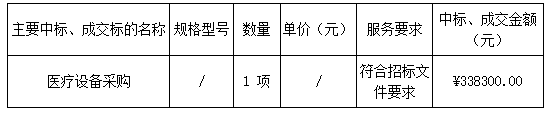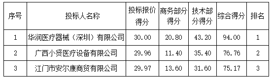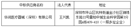 投標(biāo)結(jié)果:最終評(píng)標(biāo)委員會(huì)一致推薦 華潤(rùn)醫(yī)療器械(深圳)有限公司 為中標(biāo)單位,中標(biāo)金額為人民幣 338300.00 元,(大寫(xiě)金額: 叁拾叁萬(wàn)捌仟叁佰元整 )。