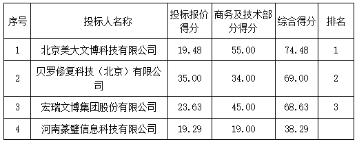 磋商結(jié)果:最終磋商小組一致推薦 北京美大文博科技有限公司 為成交單位,成交金額為人民幣194000.00元,(大寫(xiě)金額:壹拾玖萬(wàn)肆仟元整 )。