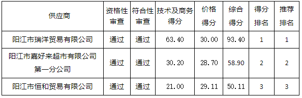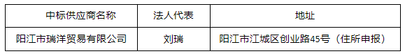 投標結(jié)果:最終評標委員會一致推薦 陽江市瑞洋貿(mào)易有限公司 為中標單位,中標金額為人民幣 497950.00 元,(大寫金額: 肆拾玖萬柒仟玖佰伍拾元整 )。