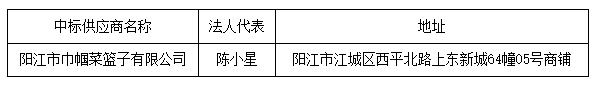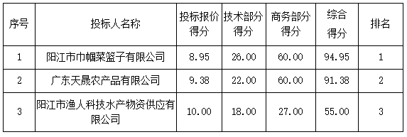 投標(biāo)結(jié)果:最終評(píng)標(biāo)委員會(huì)一致推薦 陽江市巾幗菜籃子有限公司 為中標(biāo)單位,中標(biāo)折扣率為 99.50% 。