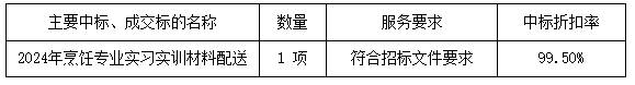 廣東業(yè)信采購(gòu)招標(biāo)有限公司受 陽江技師學(xué)院 的委托,于2024年8月16日就 陽江技師學(xué)院2024年烹飪專業(yè)實(shí)習(xí)實(shí)訓(xùn)材料配送采購(gòu)項(xiàng)目 (項(xiàng)目編號(hào):YXCG-20240601)采用公開招標(biāo)方式進(jìn)行采購(gòu)?,F(xiàn)就本次采購(gòu)的中標(biāo)結(jié)果公告如下: