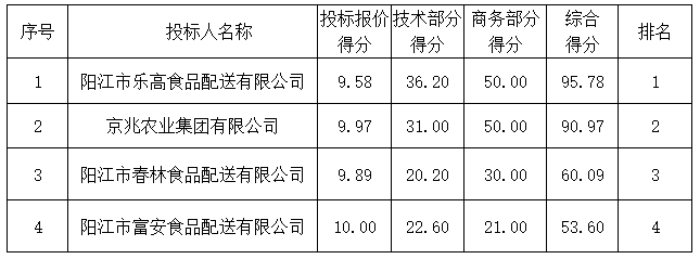 投標(biāo)結(jié)果:最終評(píng)標(biāo)委員會(huì)一致推薦陽江市樂高食品配送有限公司為中標(biāo)單位,中標(biāo)折扣率為95.00% 。